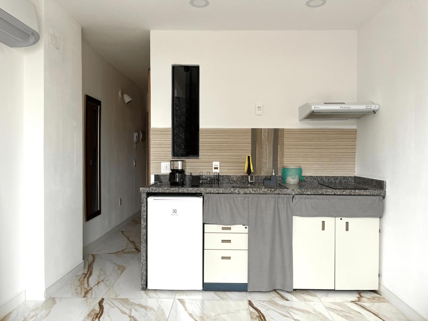 Studio. The studio provides air conditioning, a washing machine, as well as a private bathroom featuring a shower and a hairdryer. The fully equipped kitchen features a refrigerator, kitchenware, a microwave and a tea and coffee maker. This studio has a minibar, a dining area and a flat-screen TV. The unit offers 1 bed.