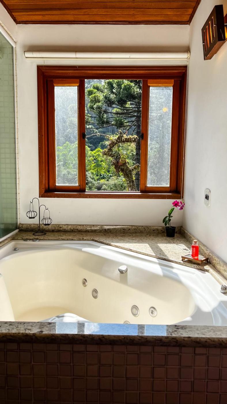 Chalé Duplex com Banheira de Hidromassagem. Guests will have a special experience as this chalet provides a hot tub and a fireplace. Boasting a private entrance, this chalet features 1 living room, 1 separate bedroom and 1 bathroom with a bath and a shower. Featuring a terrace with garden views, this chalet also features a minibar and a flat-screen TV with cable channels. The unit has 1 bed. ;
