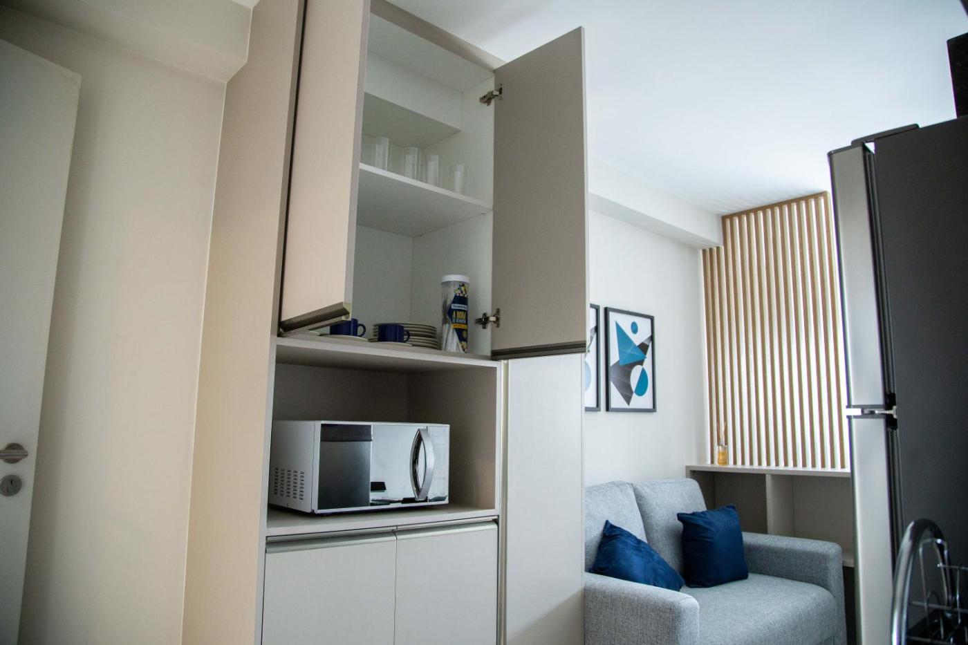 Studio Apartment. The air-conditioned apartment has 1 bedroom, 1 bathroom and a kitchenette. Guests can make meals in the kitchenette that has a stovetop, a refrigerator, kitchenware and an oven. This apartment features a wardrobe, a sofa and a flat-screen TV. The unit has 1 bed.