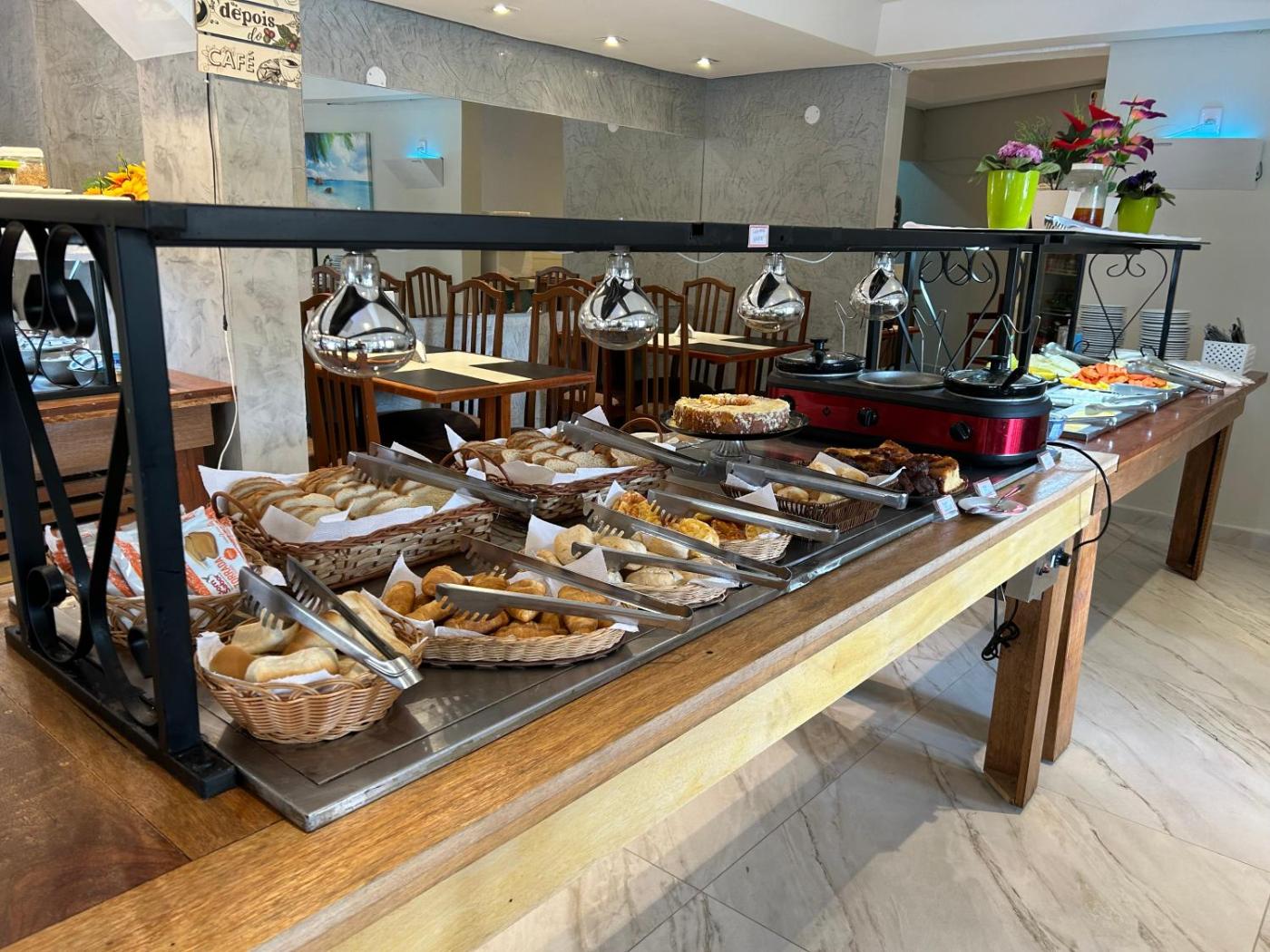 A selection of options including fresh pastries, pancakes and fruits is served for the buffet breakfast. There is a coffee shop, and packed lunches are also available.