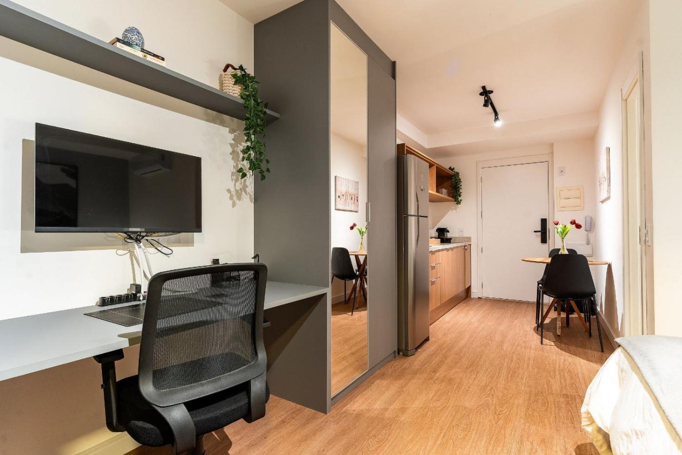 Apartment. The kitchen features a stovetop, a refrigerator and a microwave. Boasting a balcony with city views, this apartment also features air conditioning and a flat-screen TV. The unit has 1 bed.