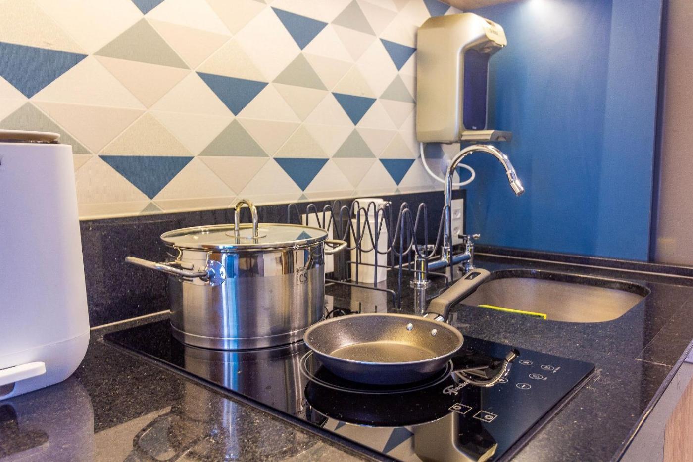 Studio Apartment with Queen Bed. The private pool is the standout feature of this apartment. The air-conditioned apartment has 1 bedroom and 1 bathroom with a shower and a hairdryer. In the fully equipped kitchen, guests will find a stovetop, a refrigerator, kitchenware and a microwave. The apartment features a flat-screen TV with streaming services, a washing machine, soundproof walls, a coffee machine as well as city views. The unit has 1 bed. ;